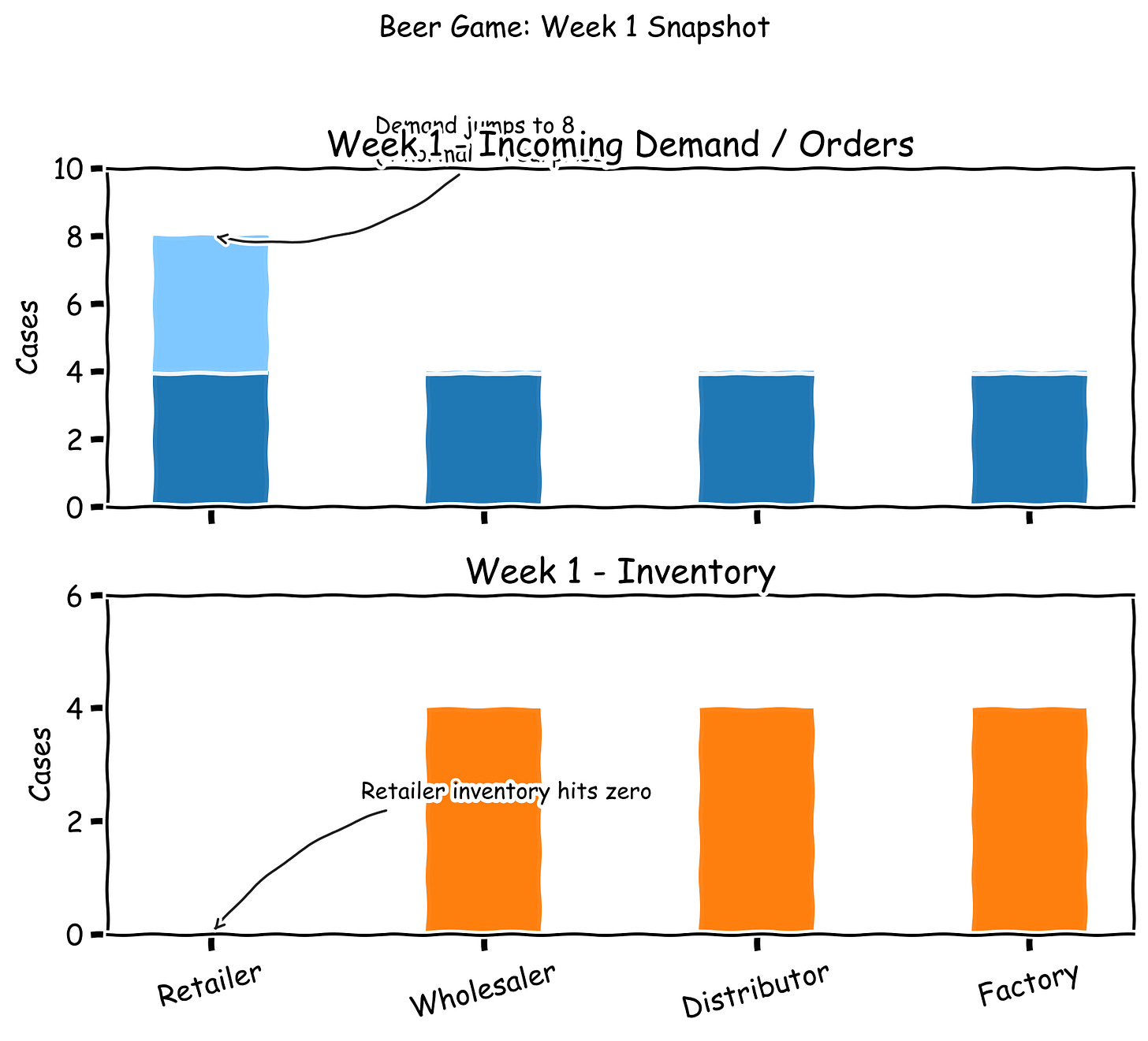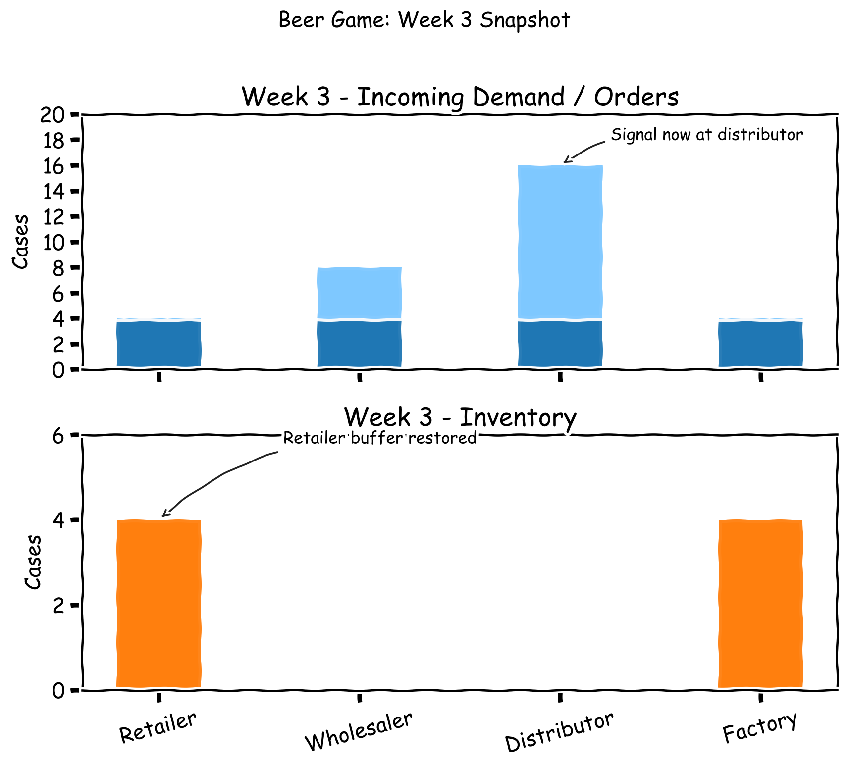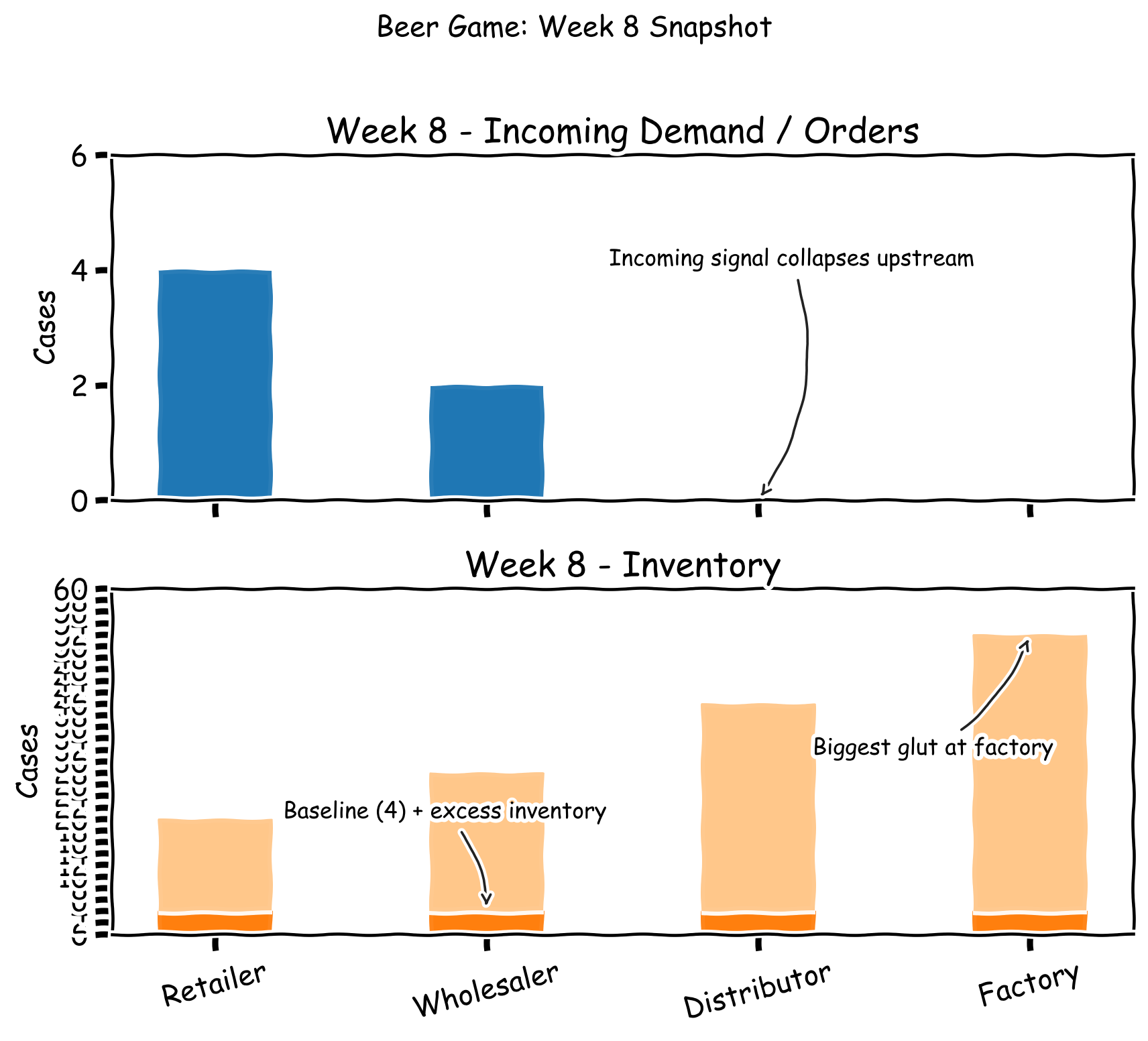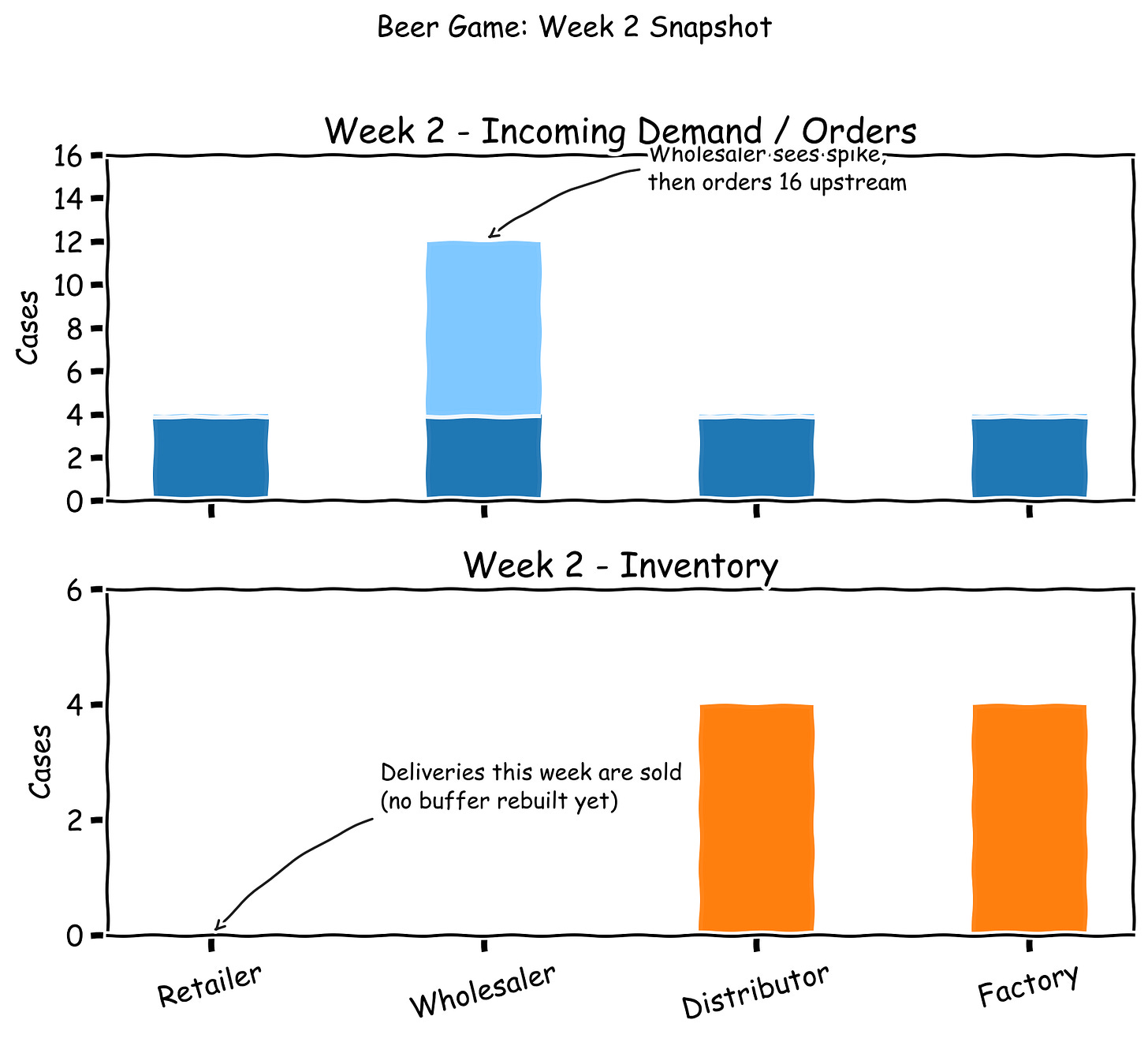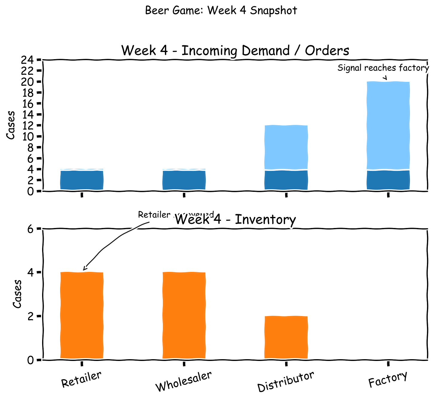 Every decision was rational. The customer demand spike was real—people genuinely wanted Mexican beer that week. Each player saw empty inventory, ordered more to cover the shortfall and rebuild their buffer. Nobody fabricated numbers. Nobody panicked.