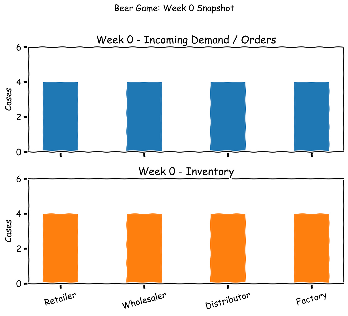 The game starts in equilibrium. Customers buy four cases of beer a week, and that number flows unchanged through every layer—retailer to wholesaler to distributor to factory. Everyone orders four, ships four, keeps four cases as a buffer. Just enough to absorb a small demand shift without panic, not enough to tie up capital. The supply chain hums along.