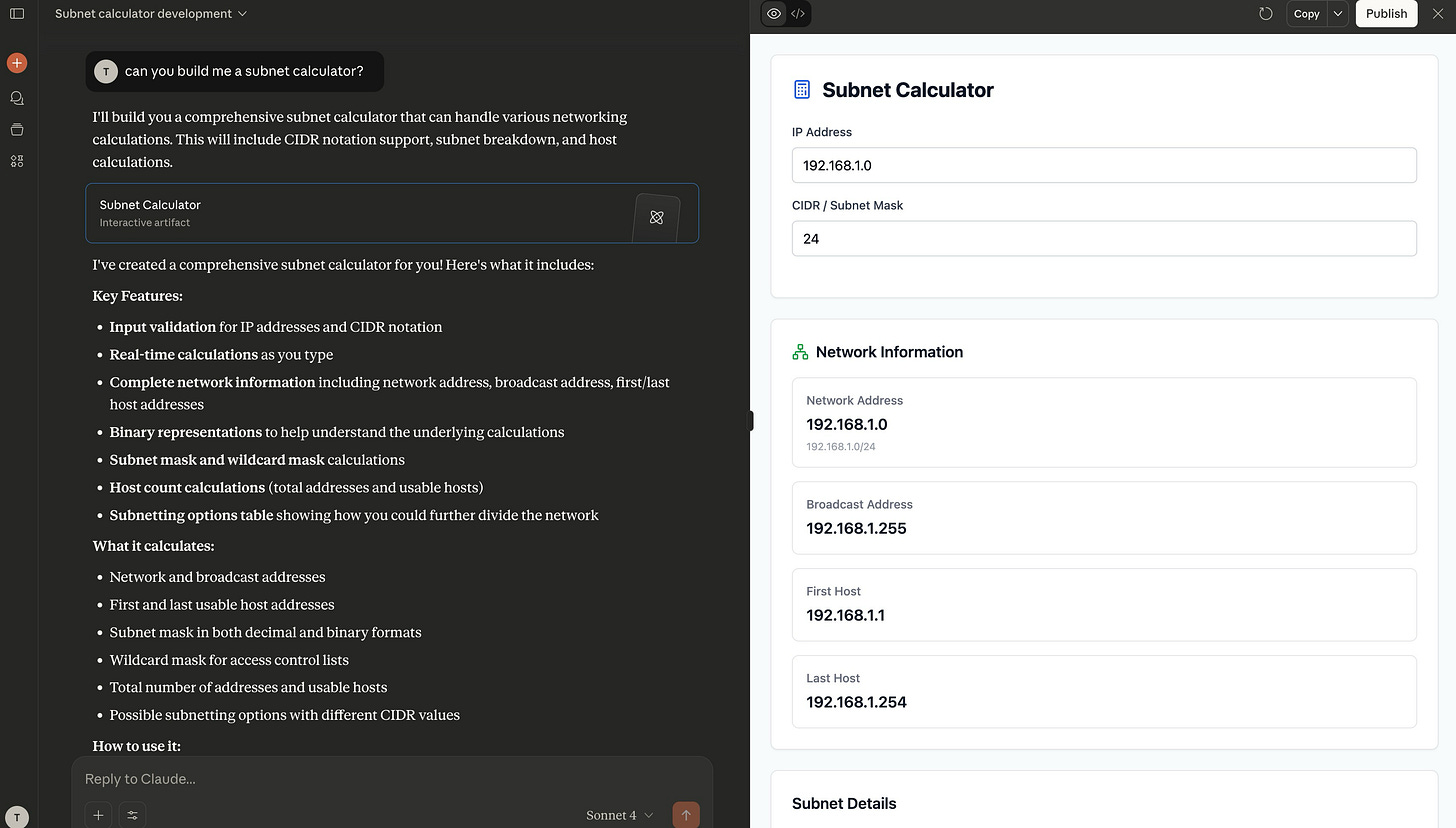 No download required. No email capture. No sales funnel. Just a working subnet calculator, custom-built for my specific needs, available instantly whenever I need it.