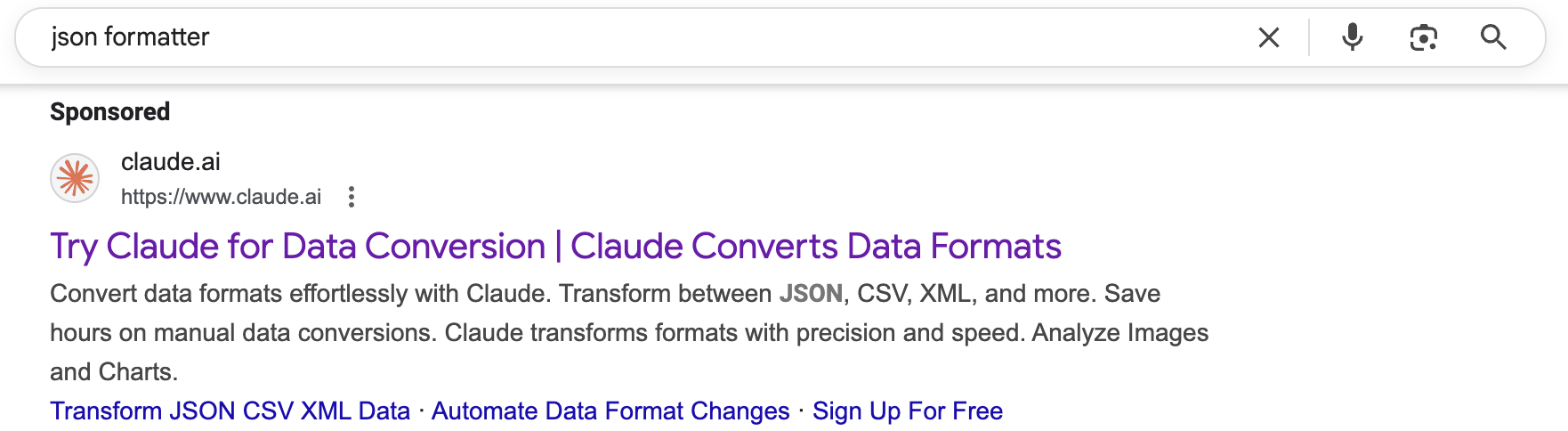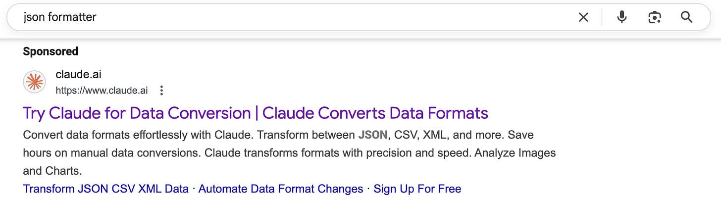 And that’s exactly what Anthropic is starting to do. Looking for a JSON formatter? You’ll likely run into a Google Ad like the ones below that Anthropic is running.